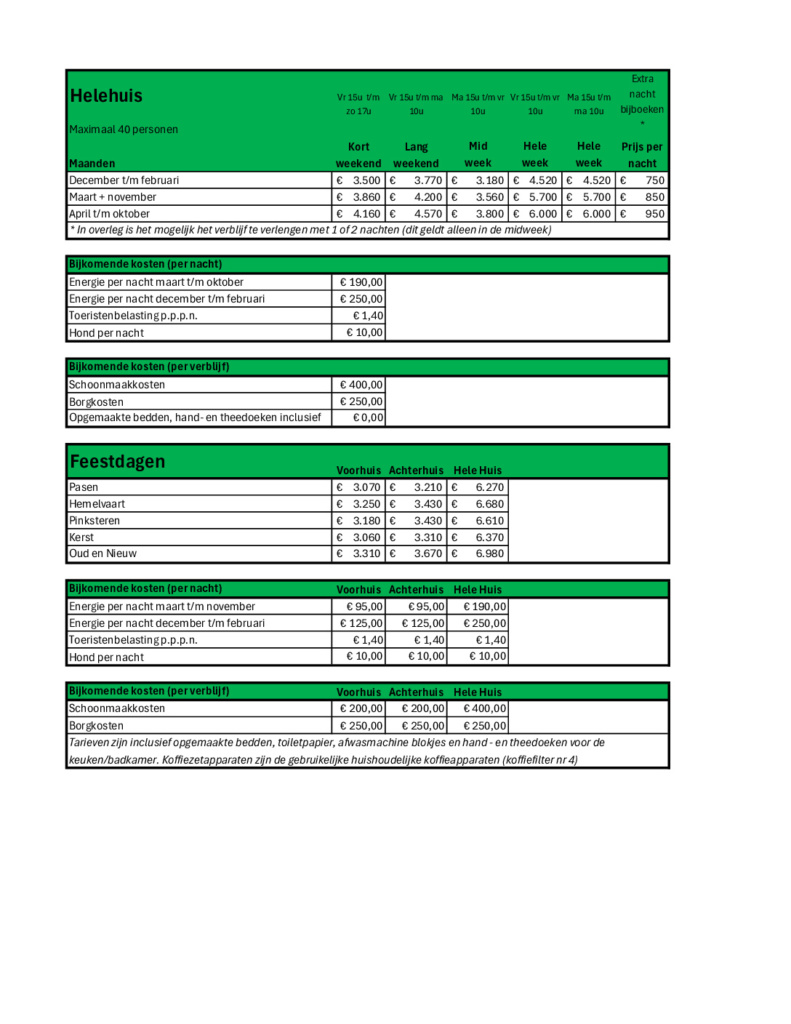 Prijzen Groepsaccomodaties