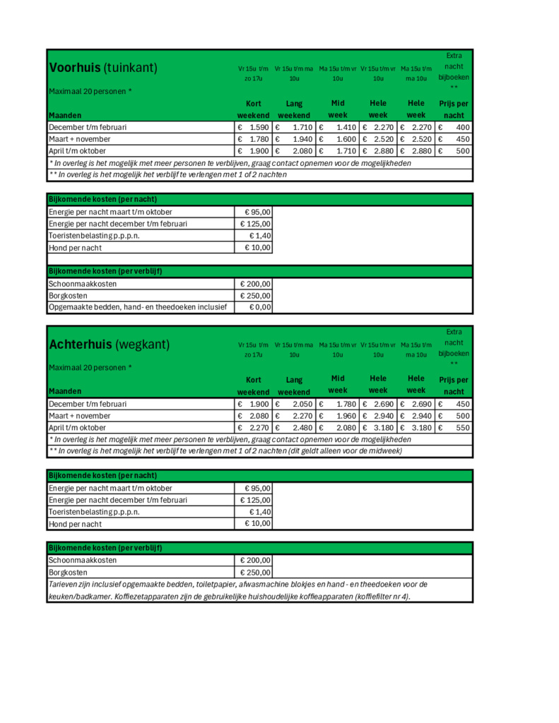 – Extra persoon €5,00 per nacht p.p. (2026: €5,50)